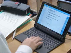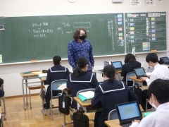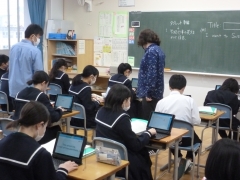 1年生英語科の授業の様子です。この授業は、前時に各自が取り組んだ「My best school event in 2021~2021年度 学校行事の思い出~」の英文を、タブレットPCを使ってタイピングの練習です。