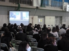本来なら、最後の学活をご参観いただくのですが、保護者の皆さまは体育館及び駐車場での待機をお願しました。体育館では、3年生を送る会で作成した動画の視聴会を行いました。