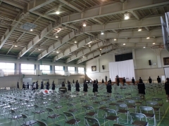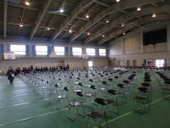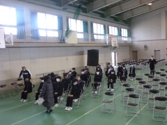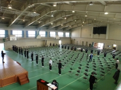 2年生が設営してくれた会場を使って、入退場の仕方、式全体の流れ、卒業証書授与の方法、式歌などの練習を行います。とはいえ、今年は感染症拡大のリスクを少しでも軽減するため、全体ではなく各学級ごとに練習を行い、全体練習の時間(学年全体が集まっている時間)を短縮します。