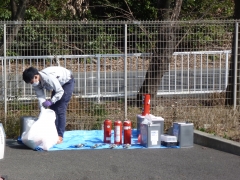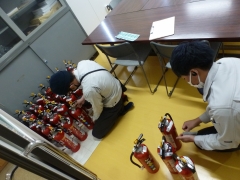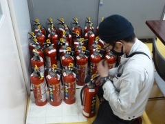 10日(木)の放課後、業者の方に消火器の定期点検をしていただきました。消火器の使用期限が切れる前に、器内の粉末薬剤の交換や噴射をするためのガスの状態、外部にキズやへこみがないかなど、1台、1台、しっかりと点検していただきました。