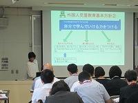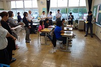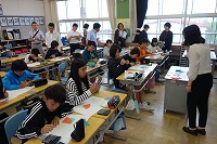 全国から先生方が三重県津市に集まって いただき、日本語指導のための指導者研修 が開催されています。 その中で、三重県内の先進校視察という ことで、研修受講の先生方に6年算数科 授業の様子を参観していただきました。 がんばって授業に取り組む子どもたちの 様子をたくさんの先生方にほめていただき ました。また、温かく、いろいろな子どもを 受け入れる雰囲気を感じる等、授業以外の ことでもご意見をいただきました。 *6年生     *つばさ教室   *笹川東小からの取組説明   *授業後の研修会  |  |