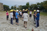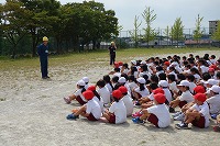 9月1日の防災の日に合わせ、毎年 この時期に避難訓練を行っています。 20分休みに震度5強の地震が発生した という想定での訓練でした。ほとんどの 子どもが運動場か教室にいたようです。 また、2人の子どもが行方不明になっている という想定の捜索訓練も合わせて行いました。 捜索している間、静かに待つことができていました。 *校舎からの避難   *行方不明者を捜索する訓練です。 捜索の指示を出しています。  *避難訓練についてのふり返りをします。 その後、みんなで避難のポーズ「ダンゴ ムシのポーズ」を練習しました。  |  |