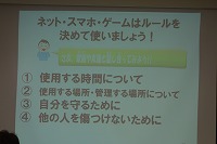 土曜授業の2限目には、保護者の皆様 向けのeネット安全安心講座を開催しました。 市役所のこども未来部こども未来課から 小林青少年育成室長を講師としてお招きし お話を聞きました。 WHO(世界保健機関)がネットゲーム などのやり過ぎで日常生活に支障をきたす 症状を「病気」と見なすことになったという ことをお話で聞きました。 ネット依存にならないよう、ご家庭で ルールを作り、ルールを守ることを確認 するようにしてください。     |  |
