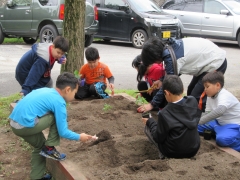 すくすく学級の子どもたちが、耕した花壇の前に集まっていました。