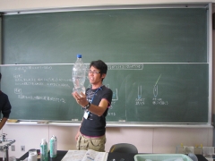 水と二酸化炭素を混ぜると、二酸化炭素が水に溶けるので、ペットボトルがペコッと凹みます。