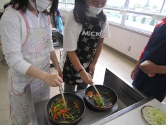 にんじんやピーマンの千切り(5mm)に、苦戦していましたが、各班で協力して楽しく作ることができました。