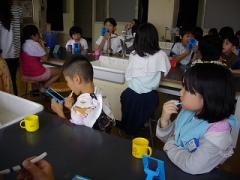 次に、前歯と奥歯の染め出しを行い、えんぴつの持ち方で、ていねいにみがく練習をしました。