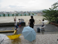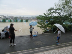 雨の合間をぬって、すくすく学級たちの子どもたちがシャボン玉づくりに挑戦しました。