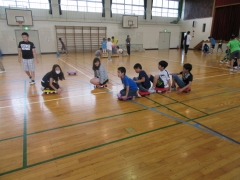 体育館にあるものを利用して「スクーターボード」で遊んだり、大きなボールのキャッチボールをしたりしました。