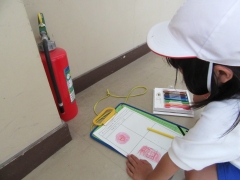 消火器や昇降口においてあるトロフィーなど、学校にあるものを見つけ、カードにまとめていました。