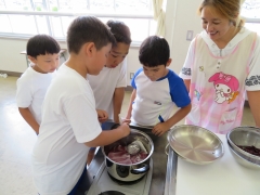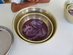 ぶどうの皮のしるで、ハンカチを染めました。保護者の方にゲストティーチャーとして来ていただきました。