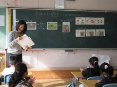 栄養教諭の先生に「ちからをだす」「おなかをそうじする」「かぜをふせぐ」などサツマイモのパワーについて教えてもらいました。