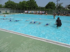 けのびやバタ足などを試した後、プールの縦で何メートル泳げたか記録をとっていました。