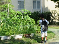 放課後、3年生の子どもがひまわりに水をあげていました。