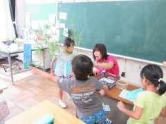 低学年の子どもたちの教室には、たくさんの短冊が結ばれた笹が飾られていました。