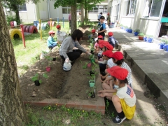 2年生が野菜の苗を丁寧に植えていました。