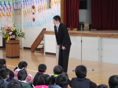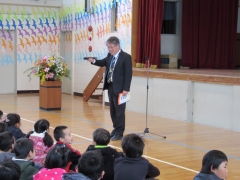 校長先生から「規則正しい生活をすること」「毎日勉強すること」「外で元気に遊ぶこと」「ヘルメットをかぶって交通安全に気をつけること」について話をしました。