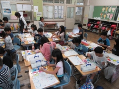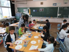 1年生はいろいろな色を染み込ませためん棒を使ってカラフルな模様をつくっていました。
