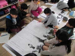 「初雪のふる日」について登場人物の様子や気持ちがわかるところに線を引き、グループで書き込みをしていました。