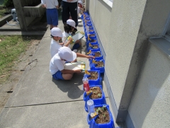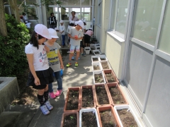 3年生が、大きくなったマリーゴールドの芽を、プランターに植えなおしました。