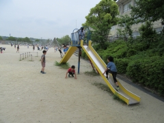 滑り台を逆にのぼったりジャンプしたりして鬼から逃げています。