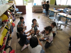 紙コップと輪ゴムを使ったおもちゃをつくって、友だちと飛ばし合いをしていました。