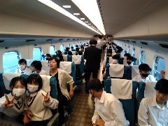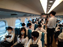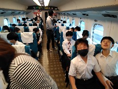時間通り名古屋に到着し、新幹線に乗車しました。車窓からの景色が飛ぶような速さで流れていくさまをみて、驚きの声も聞かれました。曇り空ながら、雨はあがっています。生徒たちの心も盛り上がっているようです。