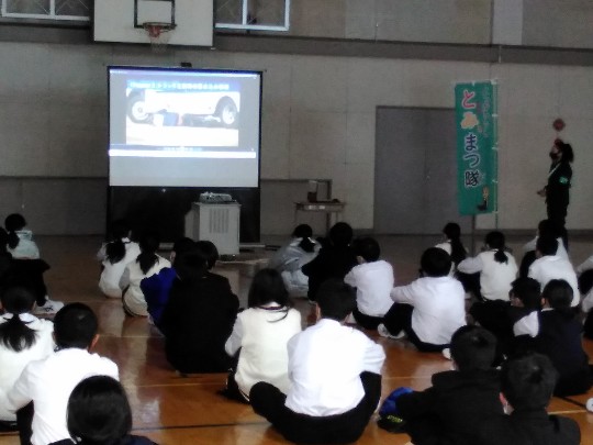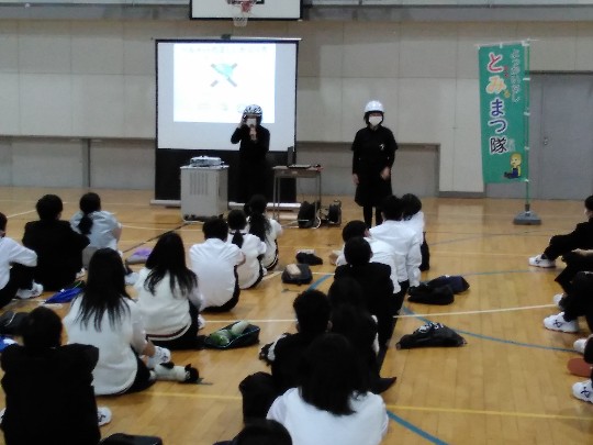 1年生総合では、市安全協議会の交通安全教育指導員(通称:とみまつ隊)の方々をお迎えし、交通安全教室を行いました。4月から自転車のヘルメット着用努力義務化を受けて、ヘルメットの正しい着用の仕方などについても指導をいただきました。