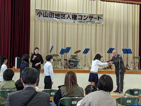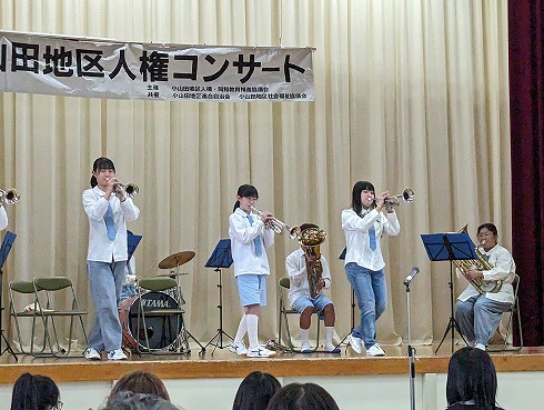 18日(土)に小山田地区人権コンサートがありました。今回はフルートとホルンの演奏で心を和まさせていただきました。コンサートに先立ち、人権標語コンクールの表彰式があり本校生徒も表彰を受けました。また地区のブラスバンド団体のOB・OGとして本校生徒も参加し、美しい演奏を披露してくれました。