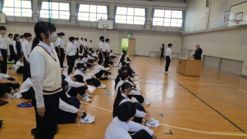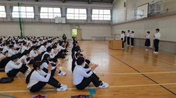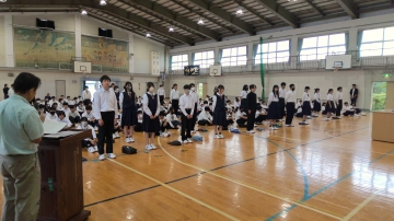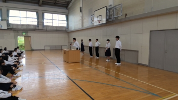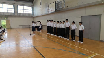 今日は生徒会本部役員と学級役員・専門委員の認証式、駅伝の壮行会が行われました。