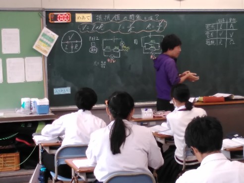 2年生理科は、電気回路における電流・電圧・抵抗の関係についての学習でした。直列の場合、回路全体の抵抗の値は2つの抵抗値の合計になりますが、並列の場合は少なくなることを知り、その不思議さを切り口に学びを深めました。