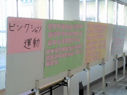 「ピンクシャツ運動」の掲示(中央廊下) わかは社会