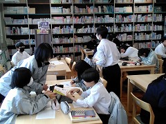 2年生国語では、先日から始まった「ある日の自分の物語を書こう」の取組を図書室で行っていました。今日は、自分の書きたいことが伝わる構成や展開の工夫について参考となる本を探し、どのように表現するとよいのかを相談しあいました。