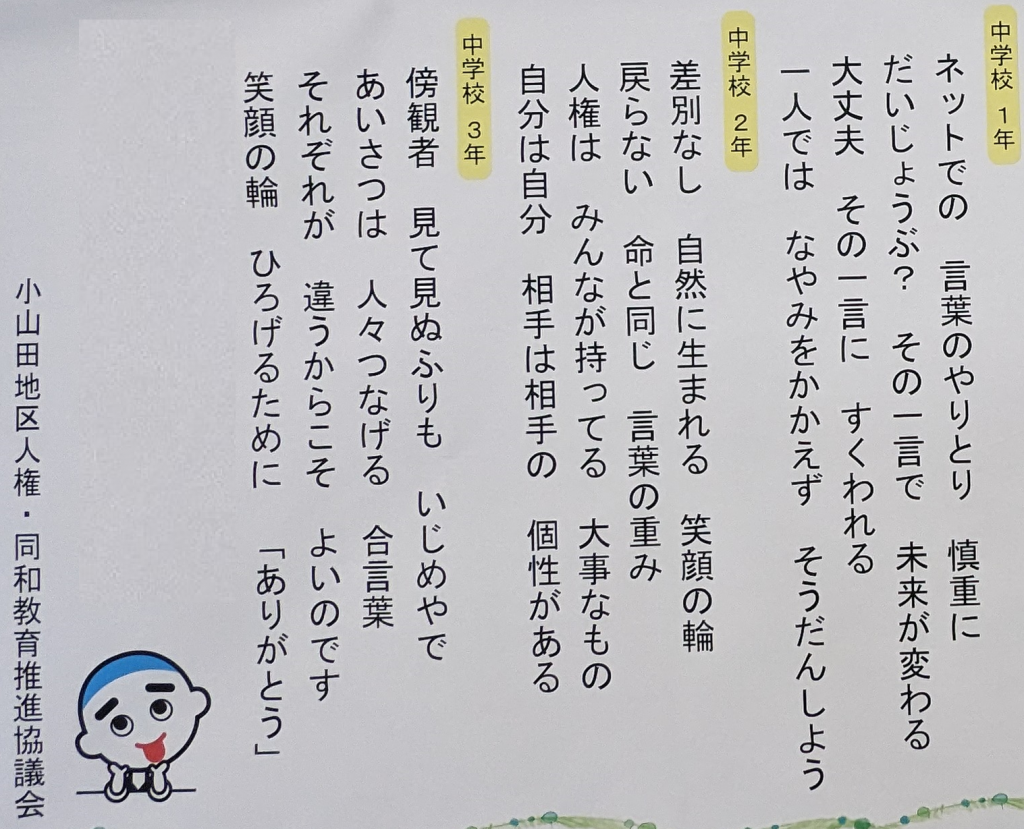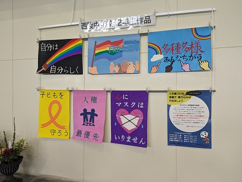 小山田地区:2年生美術「人権ポスター」<上>と全学年「人権標語」<下>