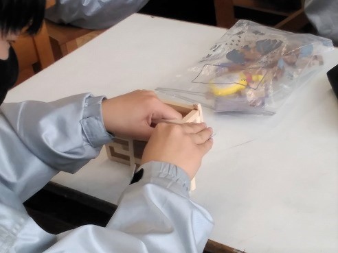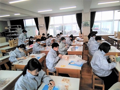 2年生美術は、寄木細工が仕上げの段階のようです。木の凸凹をベルトサンダーやサンドペーパーを使って研磨するとともに隙間や穴を木くずとボンドで埋めるなど、古来からの職人技さながらに心を込めて細かな作業に取り組んでいました。