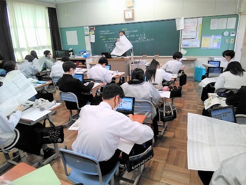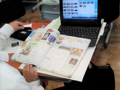1年生社会は、奈良時代の文化を学びました。東大寺に墓がないことに着目し、聖武天皇が大仏を建立した目的が個人の供養ではなく、国を鎮護することにあったことを読み解いていきました。地形図を使い、伊勢国分寺跡の位置も確かめました。