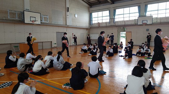 生徒会代表からの花束贈呈のあと、それぞれの先生方からの最後のお話に耳を傾けました。最後は、退場する先生方を感謝の拍手で見送りました。