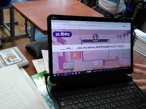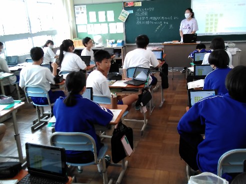 3年生英語は、学習ソフトを使って問題を作成していました。めざす生徒像の「自らの問いをもって納得解を求める」に通ずるところがある学習活動の一場面です。問いと答えの間が長くなり、論理的な思考過程がより充実することを期待します。