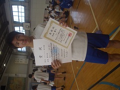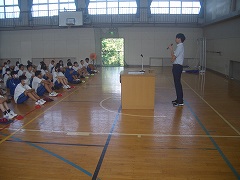 校長からの話と生徒指導担当からの話の後、表彰伝達式を行いました。中体連の大会において、本校から出場した選手がバドミントンで東海大会3位の成績を修め、優秀選手賞もいただきました。よく頑張りましたね。おめでとう!!
