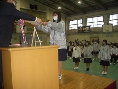 練習後、本年度最後の表彰伝達を行いました。各教科や部活動での地道な頑張りを心から称えたいと思います。<表彰対象>三泗小中学校書写展・小中美術展(出品)、バレーボール三泗選手権大会ブロック優勝、三重県小中学校書初め展(佳作)