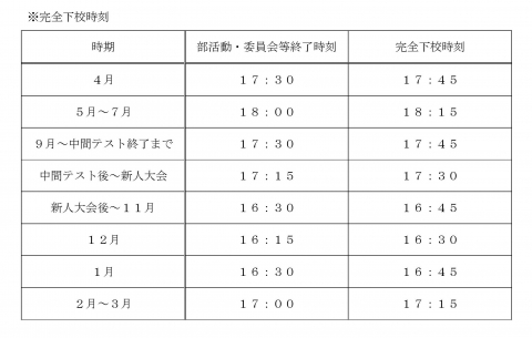 5月からは部活動の終了時刻が18:00までとなり、完全下校時刻は
