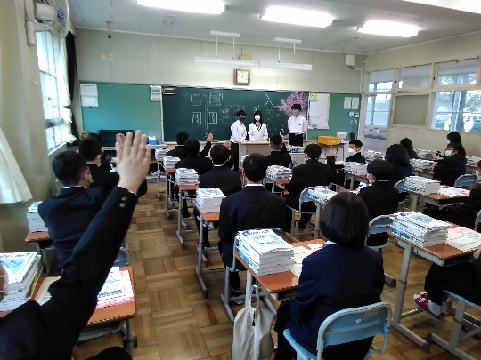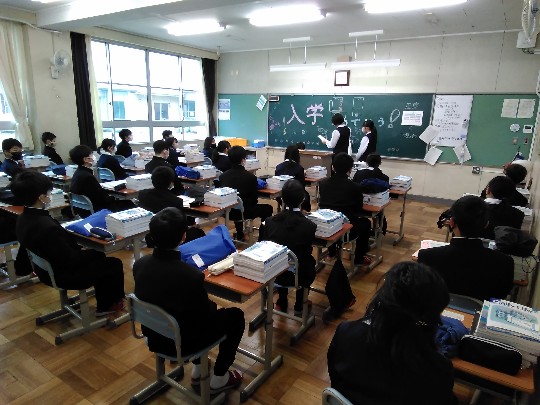 教室で在校生(生徒会役員)から式でのあいさつの仕方や動きについて事前説明を受けました。緊張もほぐれて笑顔も見られました。式場への先導も先輩たちが務めました。