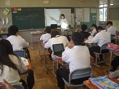 英語の授業の様子です。ICT機器の活用、グループでの学習の様子などを見ていただきました。