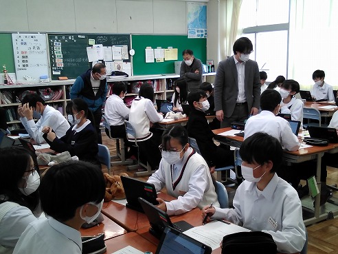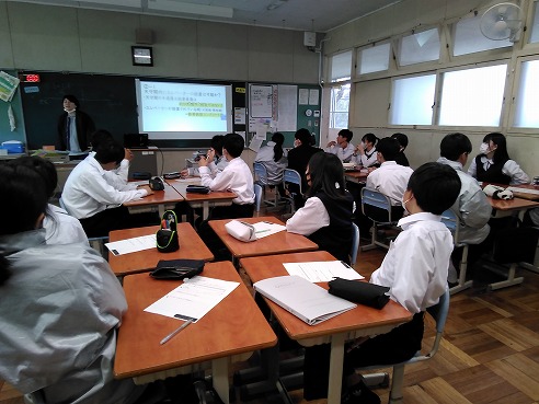 1年生総合は来週の人権フォーラムにむけ、ミニフォーラムと名付けた事前の取組を行っていました。名古屋城の天守閣にエレベーターを設置することを巡っての議論を人権の視点から進める予定です。小学生をリードしてくれる姿を期待しています。