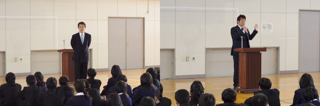 離任式では、今年度で西陵中学校から去られる5名の先生方に生徒会から花束と御礼の一言が贈られました。その後、お一人ずつお別れの言葉をいただきました。