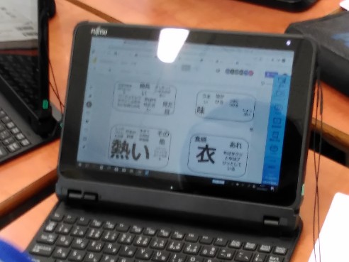 なぞなぞのような文章を考え、それを手掛かりに思い浮かべたものを推理しあっていました。タブレットにはその過程が提示されていました。