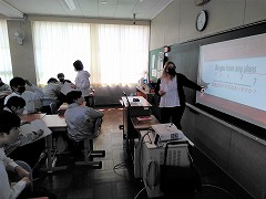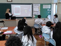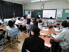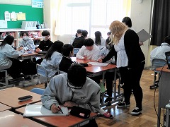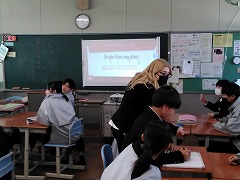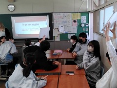 1,2年生英語は、本年度お世話になったYEF(四日市市英語指導員)の本校最後の授業となりました。「明後日は何か予定がありますか?」を「Do you have any plans ( )?」と変換する場合の空欄にあう4語を考える問題では、「明後日は、明日の次の日だから the day after tomrrowか!」と大変盛りあがっていました。 今日もほぼオールイングリッシュでしたが、ネイティブスピーカーの英語の問いや指示をきちんと理解し、クイズを楽しんでいました。伝え合う楽しさや理解できる喜びを感じながら、言語によってきらめく世界がさらに広がることを願います。 Thank you,Crystal. We won’t forget you.