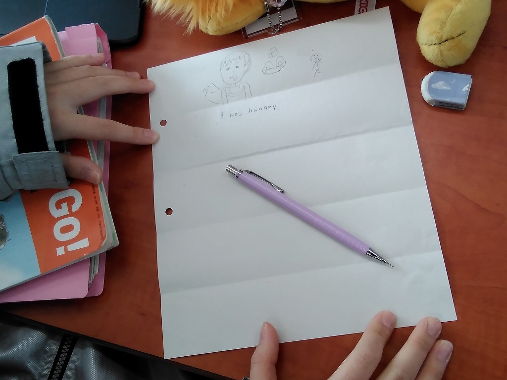 1年生英語 巧みに描かれた絵を見て、I was hugry と書けました!