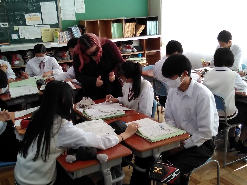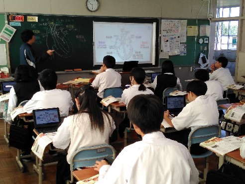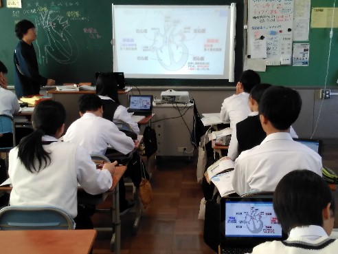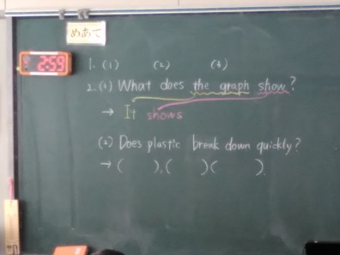 2年生理科では、黒板に心臓の図が描かれていました。血液の流れについての学習でした。赤青でそれぞれ示された動脈と静脈の違いやその働きについて学んでいきました。3年生英語では、疑問文が二つ示されていました。What で始まる場合とDoやDoesで始まる疑問文では答え方が異なることを復習していました。