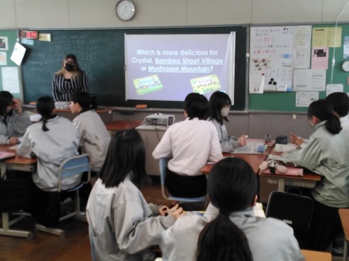 ⇩2年生英語 お菓子のパッケージで Which is more delicious…?の構文を学習中